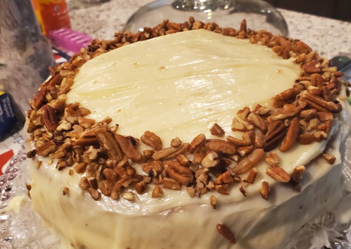 - Spread remaining icing along sides and top of cake as needed until entire cake is covered. If desired, sprinkle chopped pecans along the edge of cake. Chill for 30 minutes before serving.