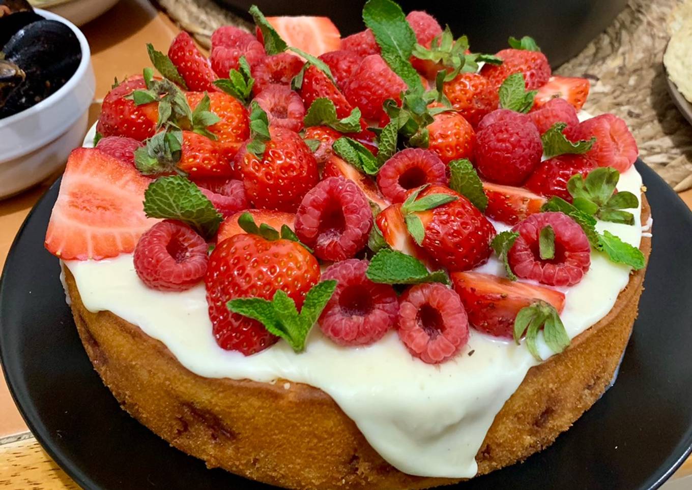- To prepare the chocolate glaze, heat the double cream and vanilla until almost simmering. Pour slowly into the chocolate while whisking until the chocolate have melted. Glaze the top of the cake and decorate with the strawberries and raspberries.