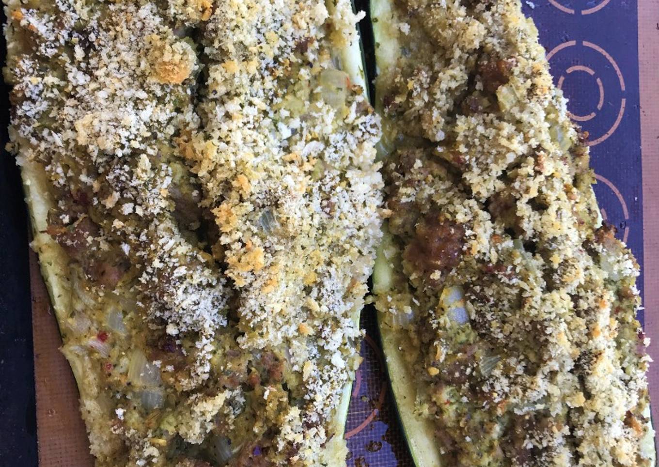 - Remove the zucchini shells from the oven. Fill with the sausage mixture. Coat heavily with panko. Drizzle with remaining olive oil.