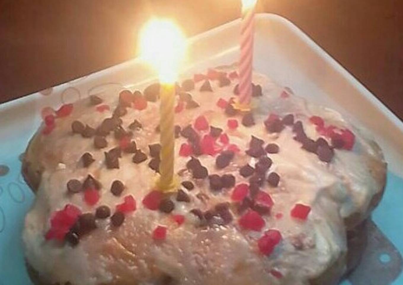 - Now divide the cakes into two halves horizontally.Takethe lower part of one cake(like chocolate cake). brush some water on it.spread the butter cream on it.put the upper part of another flavoured cake(like vanilla cake)on it.spread some cream on it and furnish with choco chips and trutifruti.