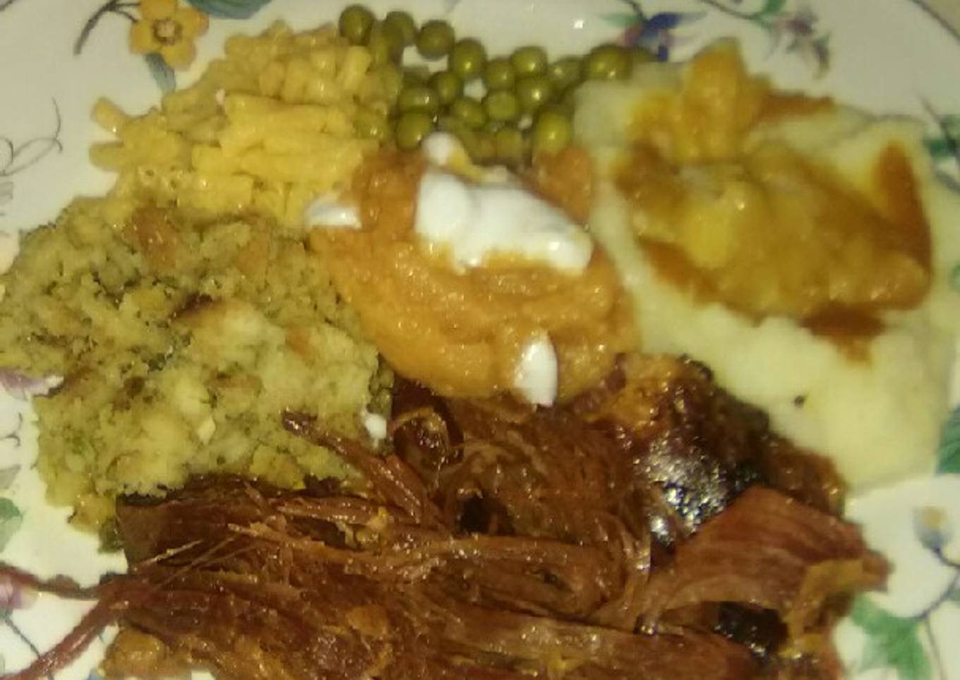 - In a large bowl make mashed potatoes and set aside to keep warm...In another medium bowl add the all 3 cans corn and 2 Tbsp. Butter heat in microwave til butter is melted and stir til combined, set aside to keep warm...do the same with the peas.