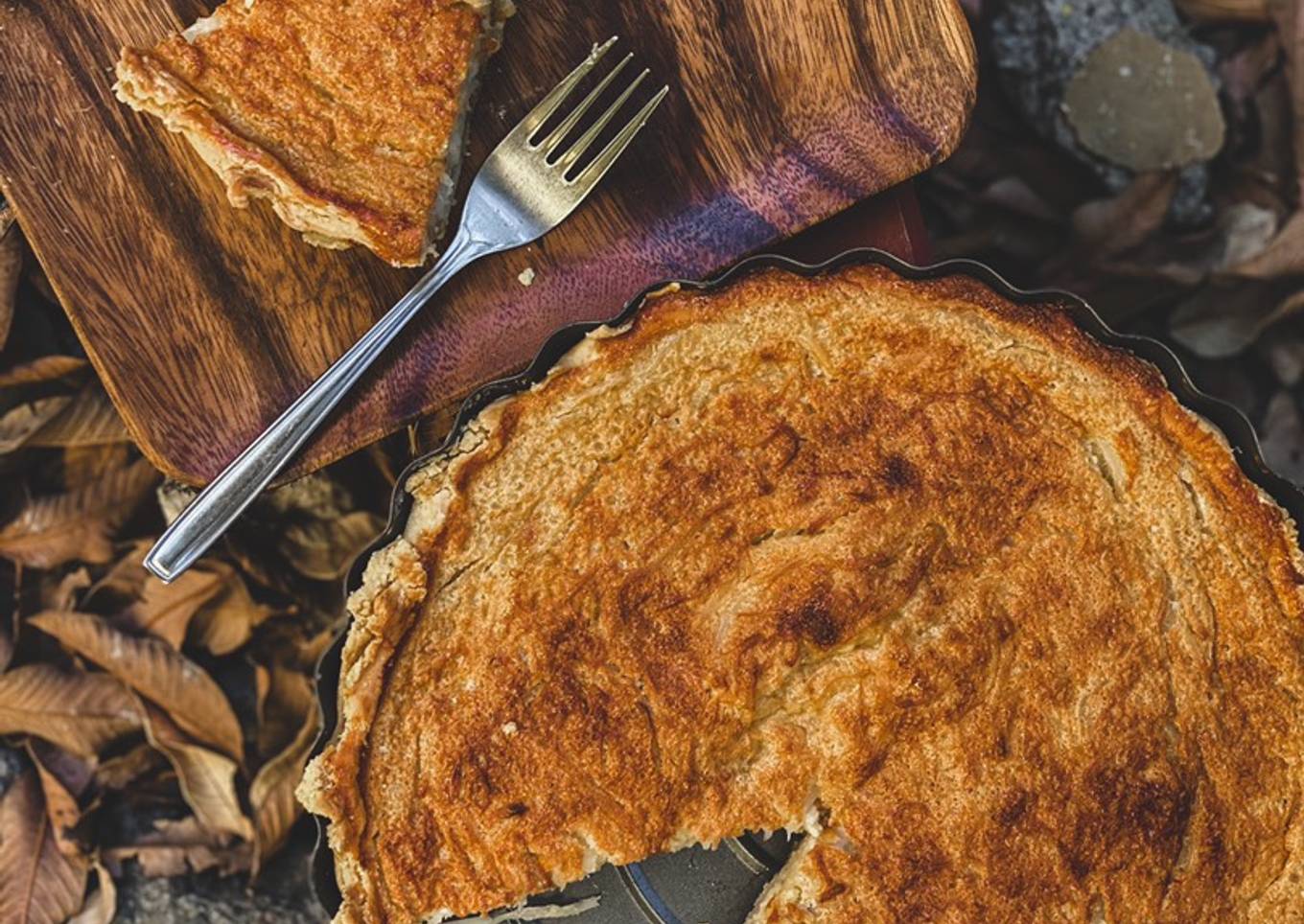 - Take out the puff pastry from the fridge and lay it out in the pie pan. Flatten the pastry and make sure the sides of the pan well-covered. Trim the excess. Put back the pan with the oastry inaide the fridge to set.